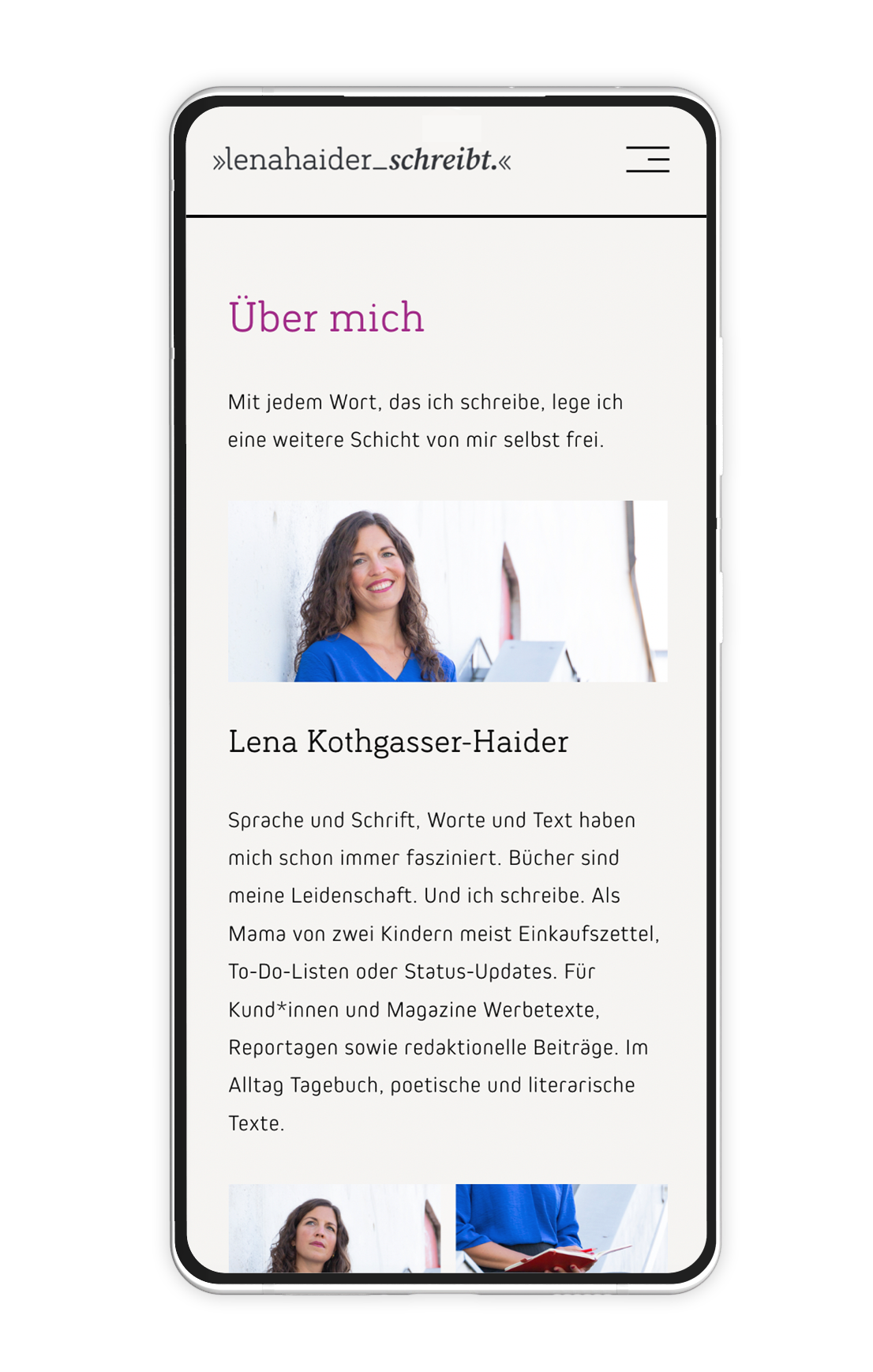 Lena Haider schreibt für Websites, Folder, Magazine. Als Autorin schreibt sie Kurzgeschichten, Essays, Fragmente. Als Schreibende schreibt sie Tagebuch, Morgenseiten, Erinnerungen. Und für all das Geschriebene hab ich eine Website entworfen und umgesetzt. Das Design ist reduziert um dem Text den Raum zu geben, den er braucht.