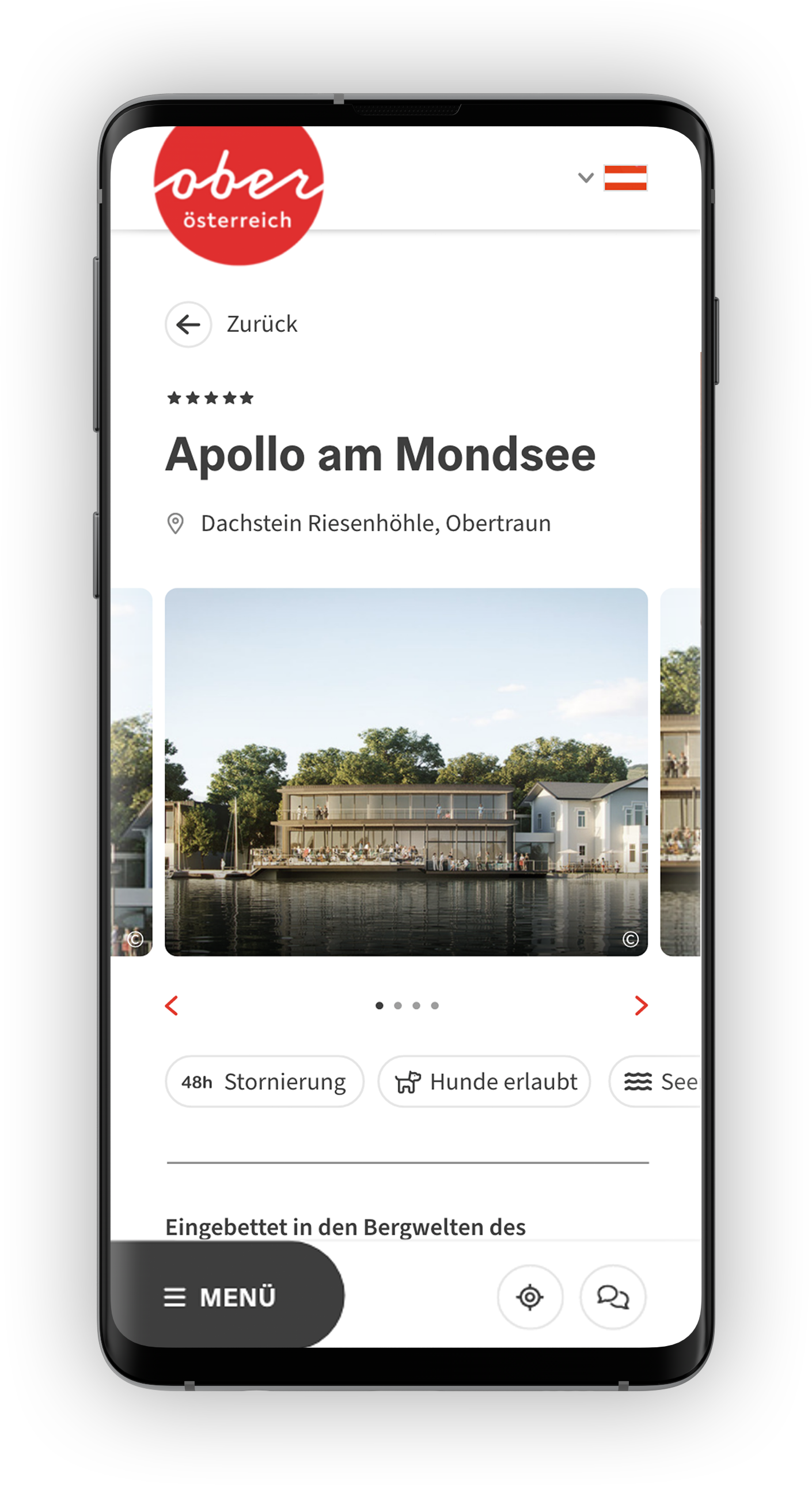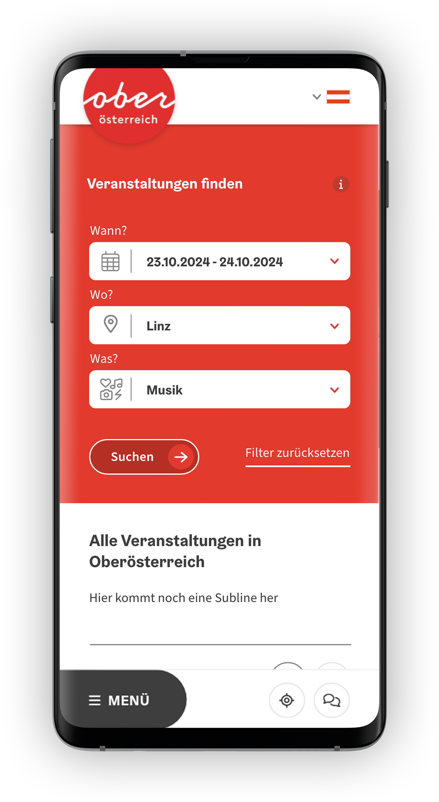 Das Design hat passend zum runden roten OÖ Logo, runde rote Elemente erhalten. Rote Pfeile, runde Buttons, abgerundete Ecken,…